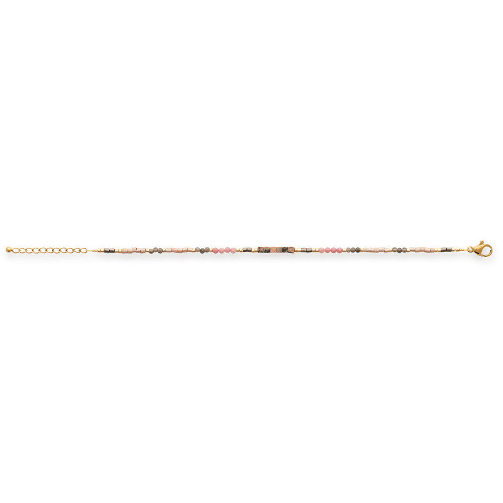 Le bracelet en rhodonite naturelle se distingue par ses teintes roses marbrées de noir, à la fois douces et élégantes. Facile à porter au quotidien, il s’intègre aussi bien à un style décontracté qu’à une tenue plus habillée.